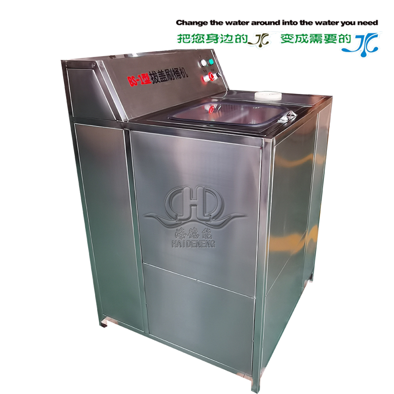 ◇ 刷桶拔蓋機適用于3加侖、5加侖飲用水回收桶的蓋、桶分離。分離后的桶蓋無磨損、不變形,經過消毒后可以重復使用,提高了桶蓋的利用率。本機采用氣壓為動力,安全可靠。額定氣源壓力為0.5MPA/cm2,進氣量≥0.1m3/分鐘,拔蓋速率為200~300只/小時。接通氣源,將回收桶倒置后把桶口插入拔蓋頭內,然后踩動腳踏開關,桶蓋即可拔下,自滑槽中滑出。